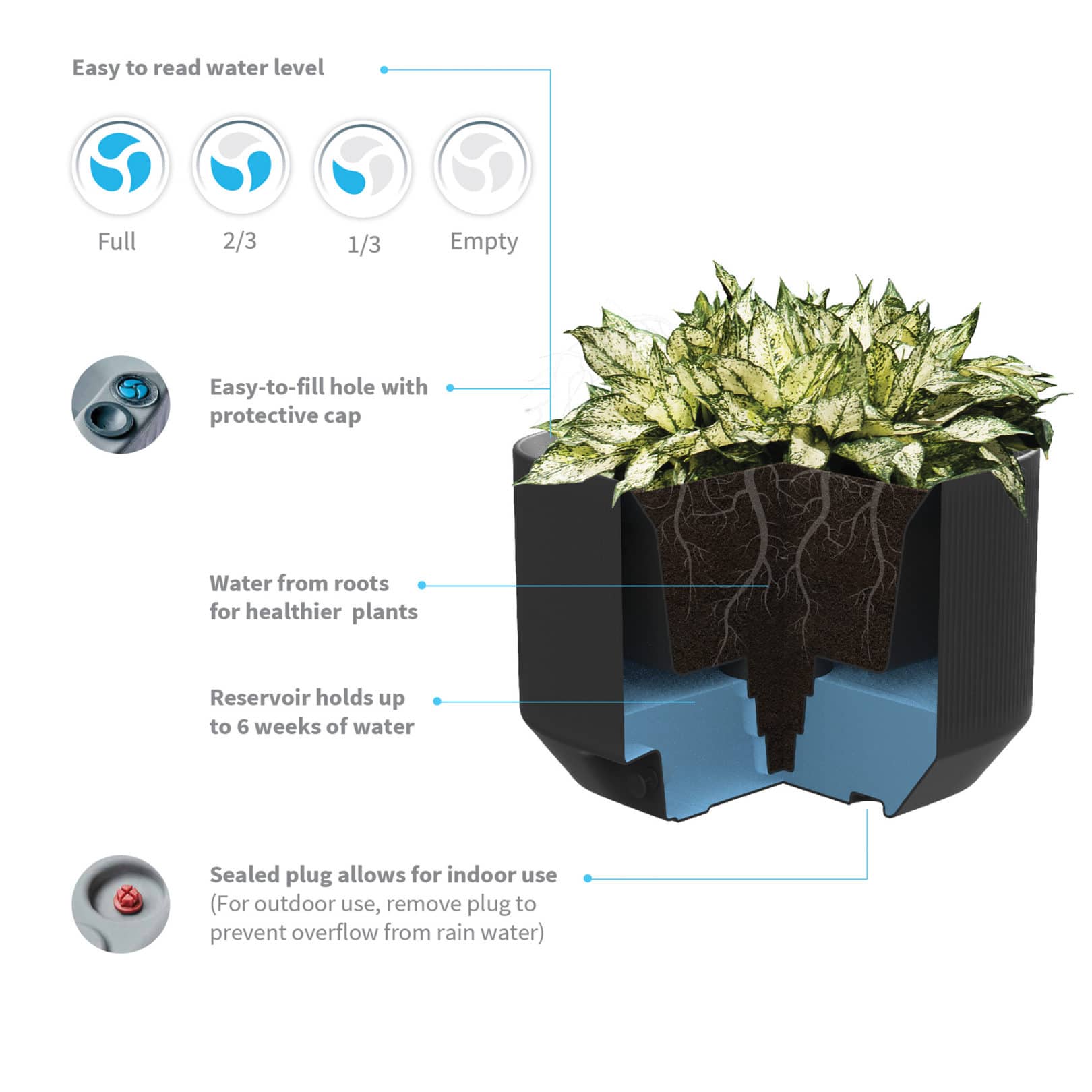 • Easy-to-read water level indicator lets you know when your plants need water