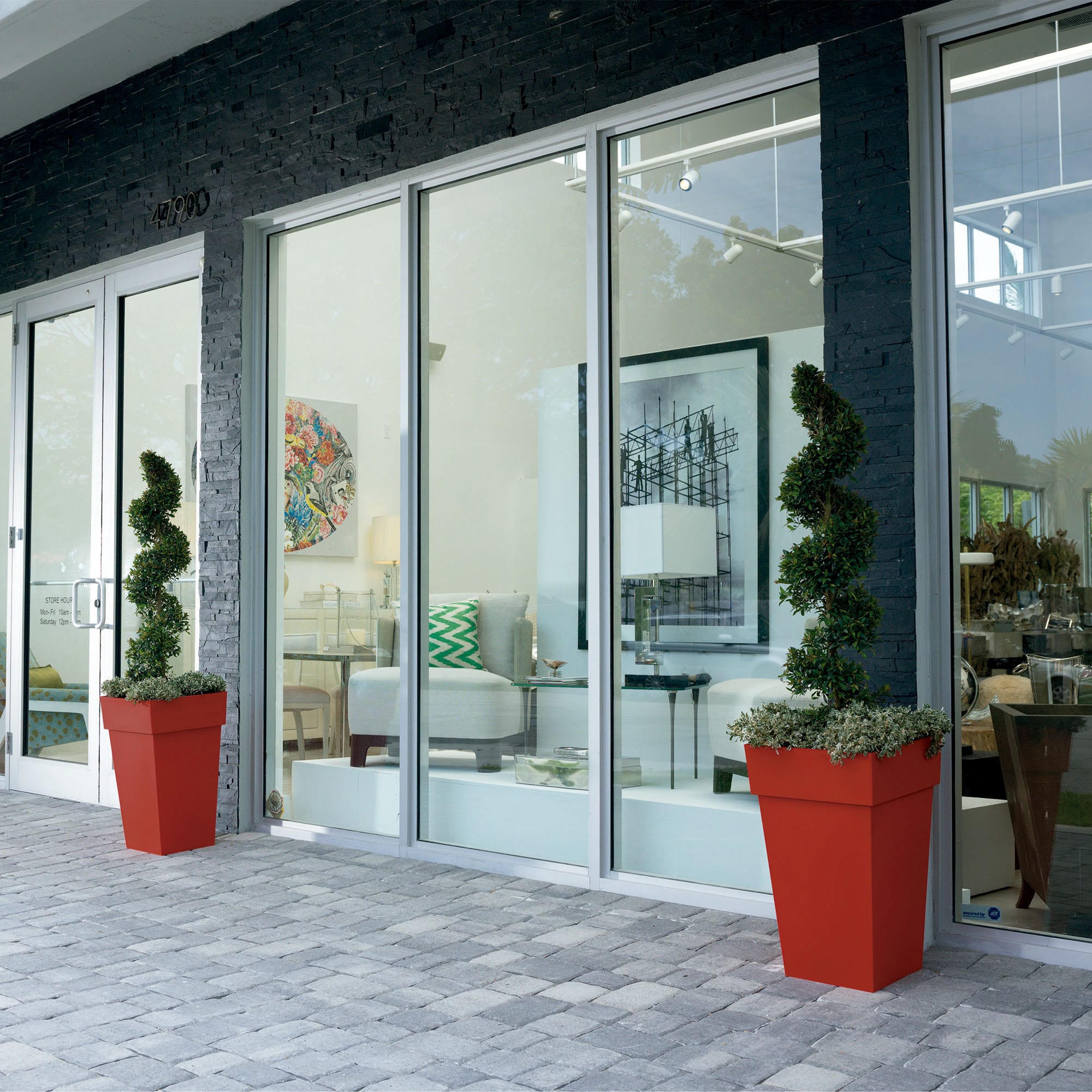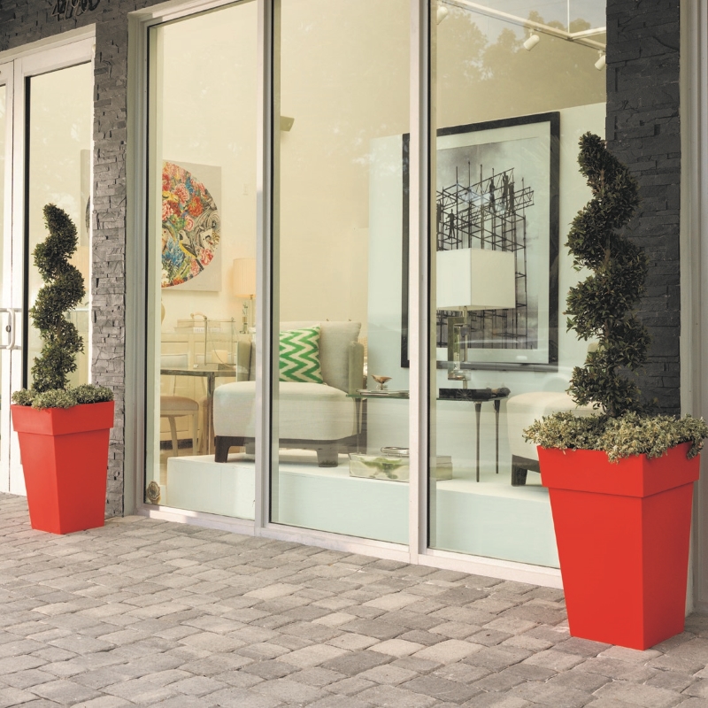 The modern Pierre Large Tall Square Planters are offered in bold colors to call attention to storefronts, and entryways.